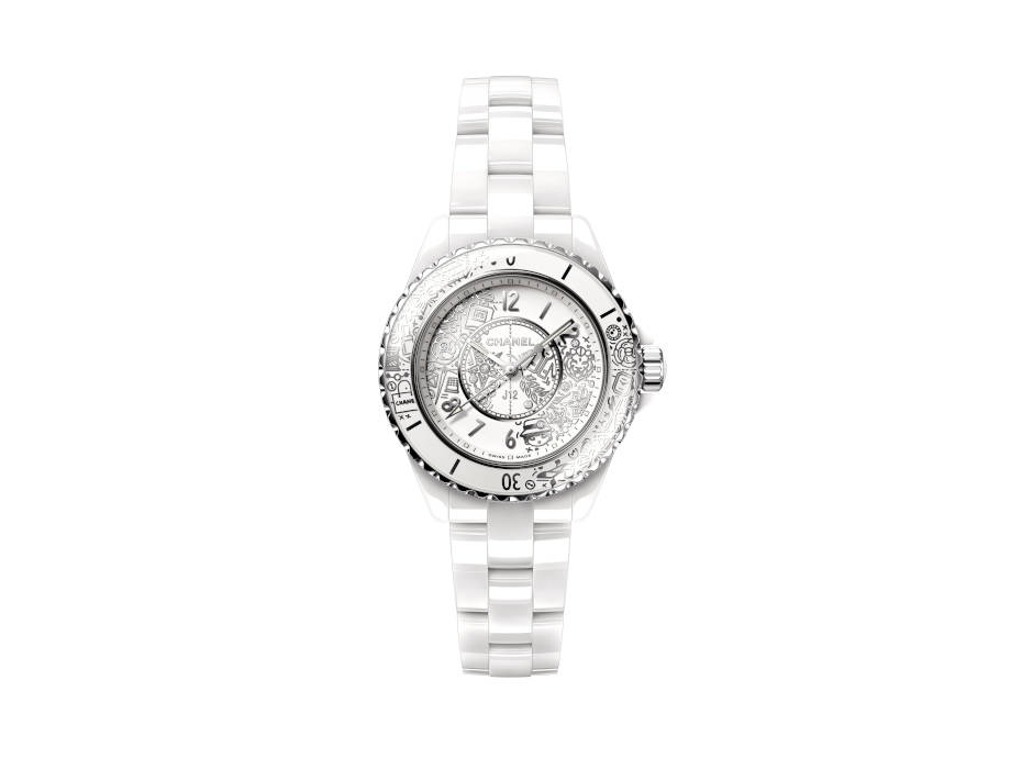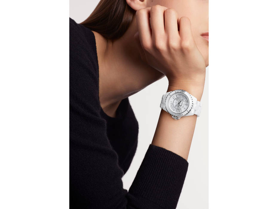 For its 20th anniversary, the J12 wants to play. It takes twenty symbols and references from the Maison CHANEL: a 2.55 bag, a camellia, a bottle of N°5 perfume and even a tweed jacket.