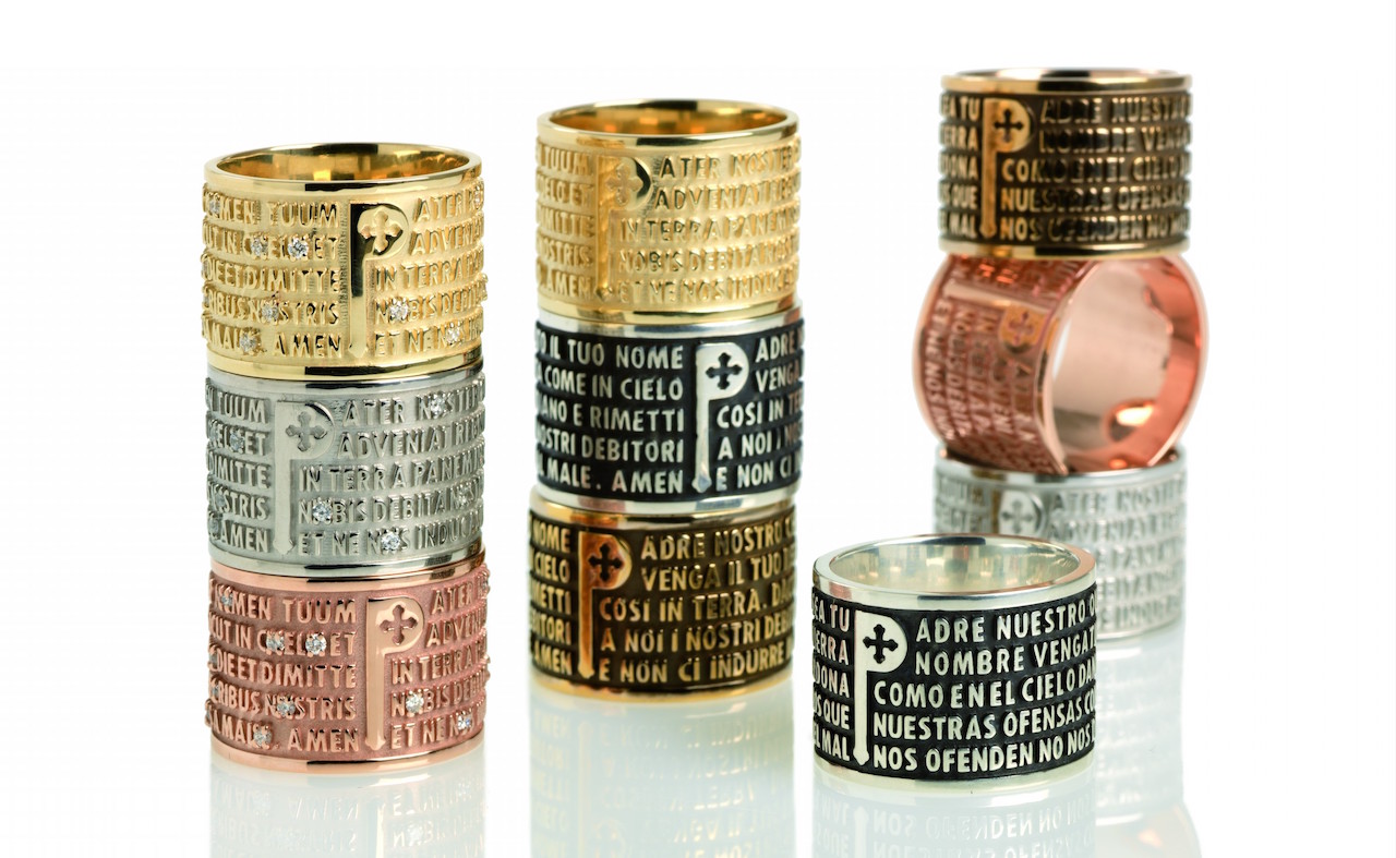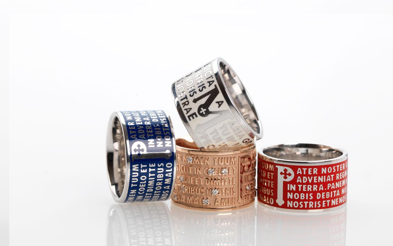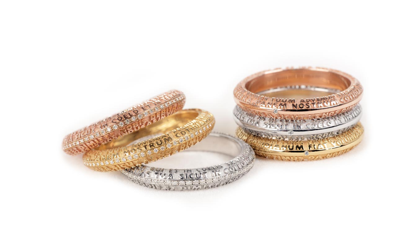 La precisión de las letras que ya caracterizaban los aros, se lleva a una escala aún menor: creada con la ayuda de una nueva y extraordinaria técnica de microfusión, que da relieve a las palabras del "Pater Noster" en un grosor de tan solo 5 milímetros. .