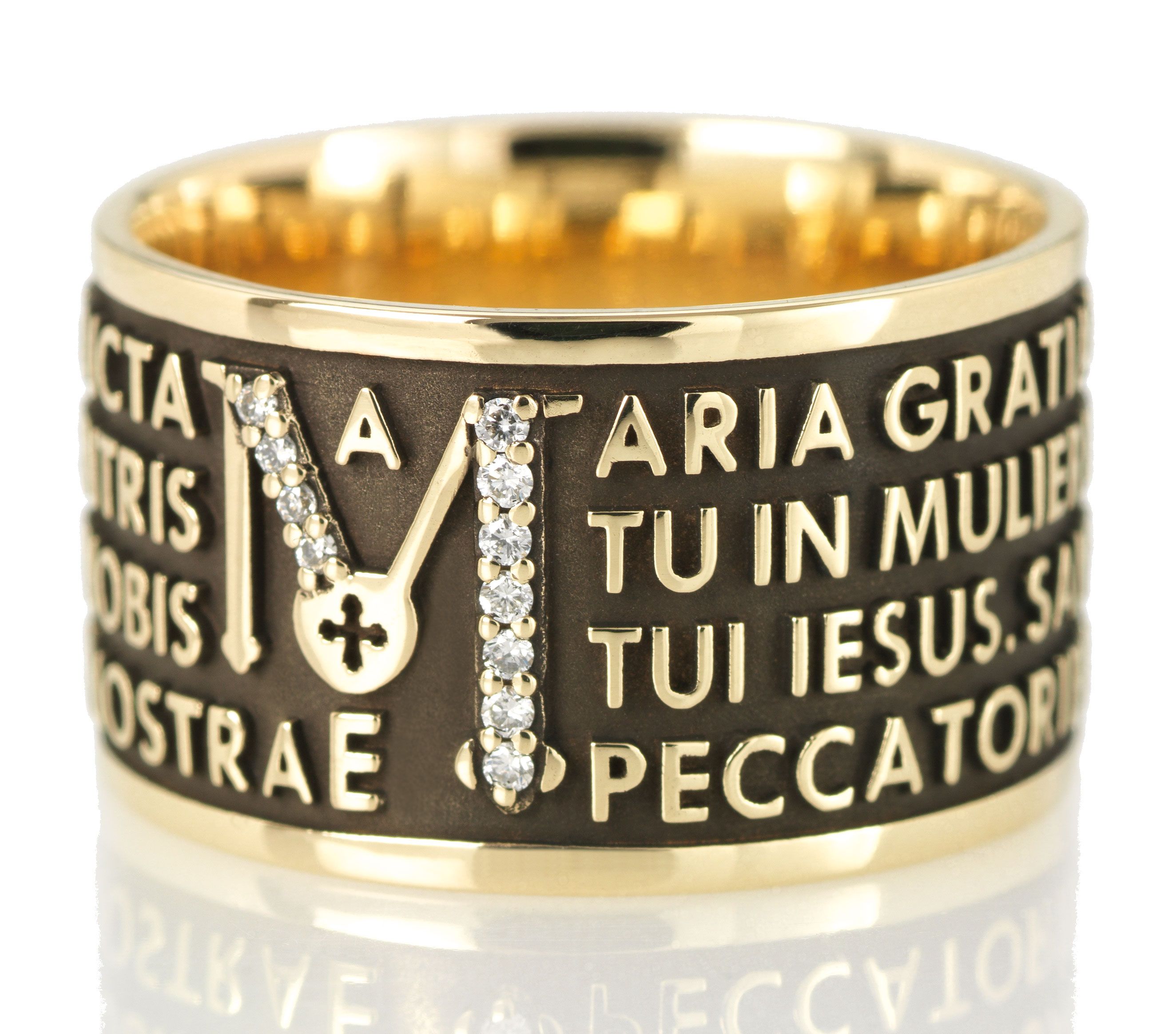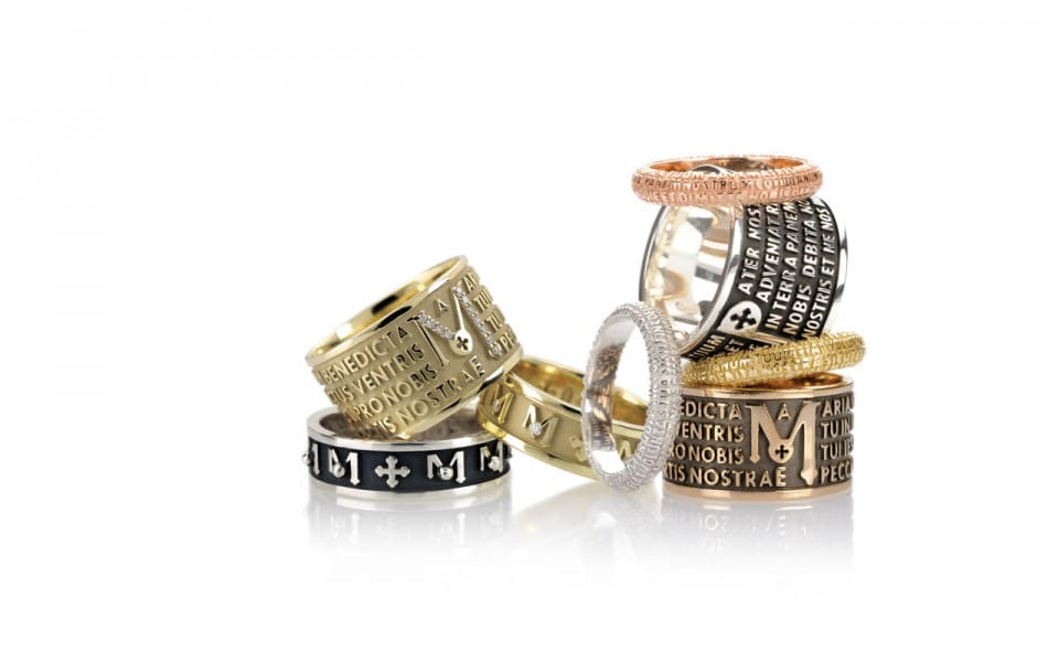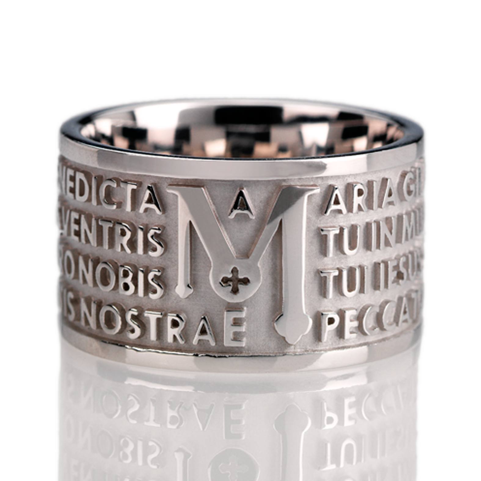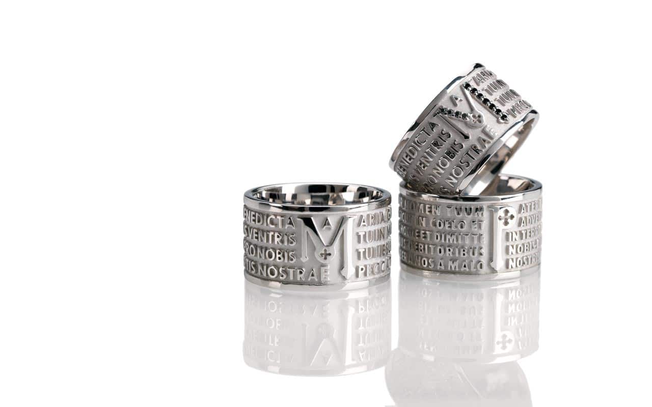Esta colección representa el alma de los anillos ORIGINE y TUAM antes de continuar con su galvanización. Gracias al brillo del rodio, la letra del “Pater Noster” y del “Ave Maria” se destaca de manera extraordinaria.