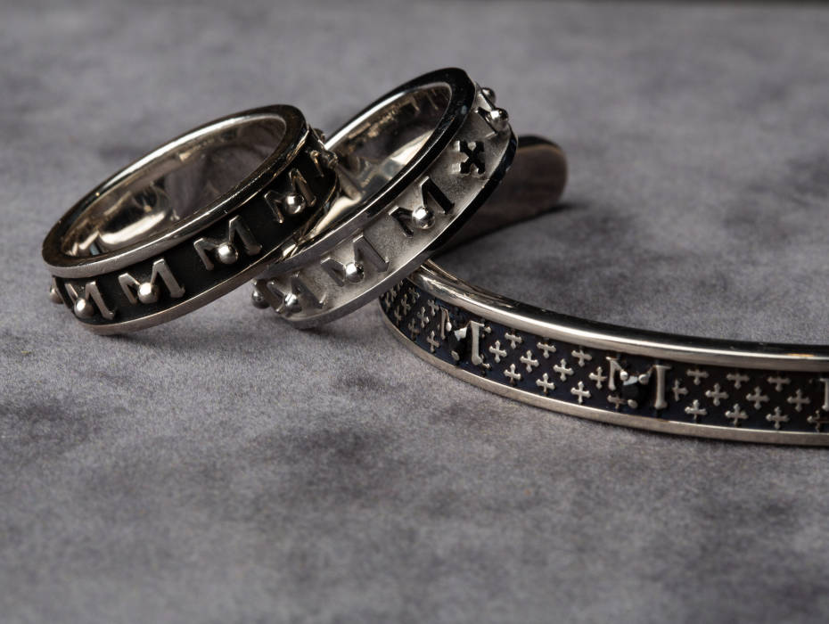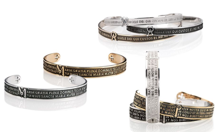 Fieles a la idea de hacer tangible el mensaje, las pulseras semirrígidas ORIGINE, TUAM y ANGELO evocan en detalle al primogénito de las creaciones de TUUM: el icónico aro. Realizados en plata 925, modelo brazalete, llevan impresas en relieve y rigurosamente en latín las palabras del Padre Nuestro, el Ave María y el Ángel de Dios. Al igual que en el anillo, las letras mayúsculas P y M se imponen para recordar los hermosos manuscritos ilustrados de la tradición medieval.