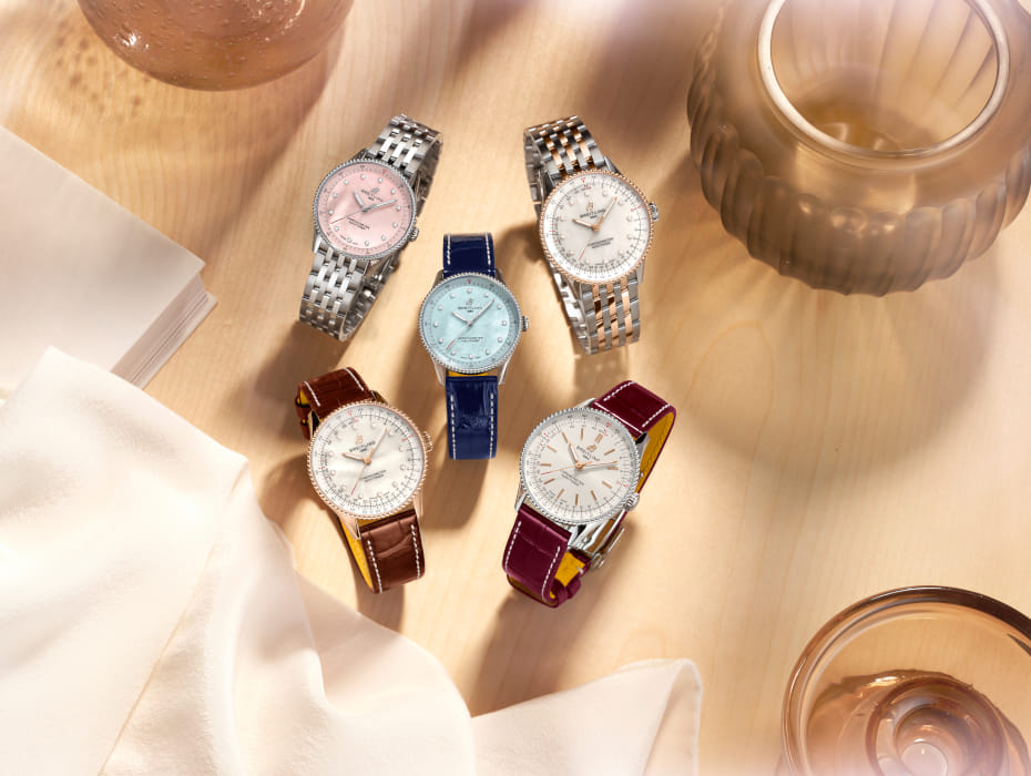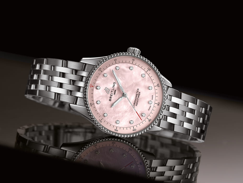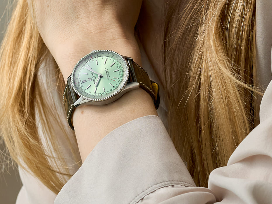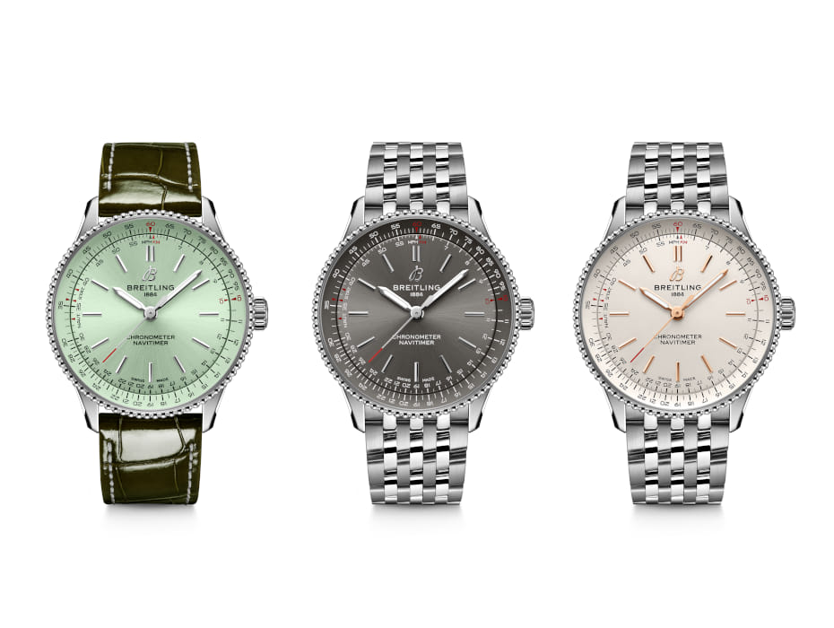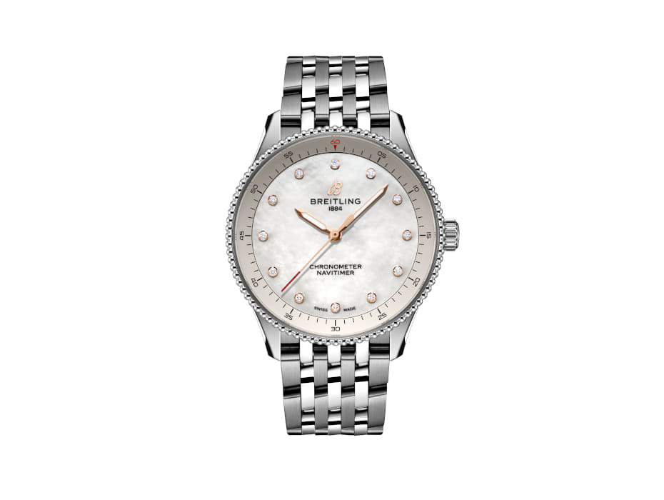 El Navitimer de 36 mm cuenta con el bisel perlado y la icónica regla de cálculo circular (utilizada por los pilotos como calculadora analógica) que confieren al Navitimer su aspecto inconfundible. Se presenta en un trío de elegantes esferas de colores metalizados (verde menta, antracita y plateado) con índices de bastón, o bien con esfera de madreperla blanca engastada con «mejores diamantes» de talla redonda.